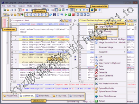 的比較,並且可以對比較的文件進行合併,同步等操作,支援撤消操作。擁有書籤與收